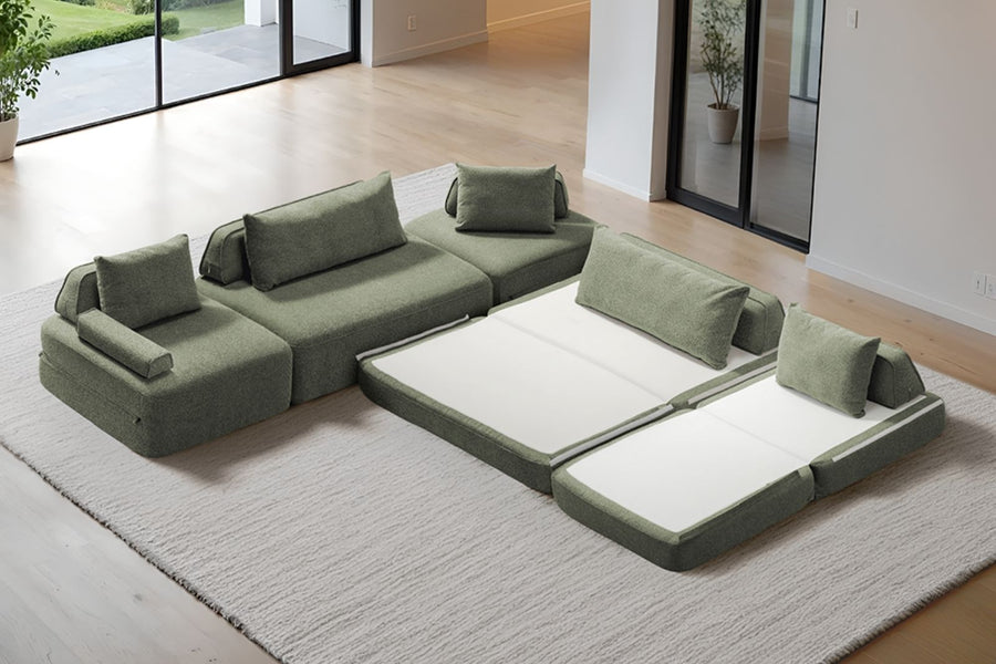 Cushie Modular Sofa Bed transforms from a stylish seat to a cozy bed in seconds—just flip and snooze. Unlike traditional sleeper sofas with noisy metal frames and complex pull-outs, Cushie keeps it simple and silent.