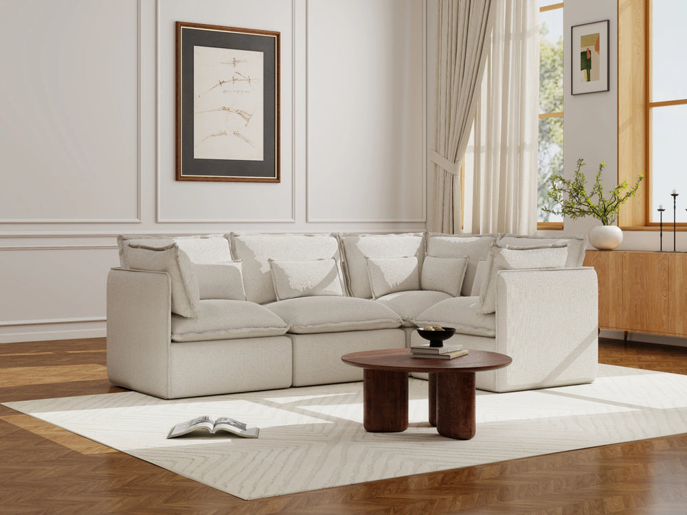 I originally got the 4 seater, I’ve since added two more seats and 2 ottomans. I have 2 toddlers and a dog (and a tradie) AND the white version and I am super impressed with the way it spot cleans. I’ve gotten pen, raspberry and chocolate off without having to wash it in the machine. The pillows get softer everytime we sit on it and it’s firm enough that it has decent support in the back. I hope they bring out more colours! Maybe boucle grey?? Or a chocolate! It has not disappointed me yet!
